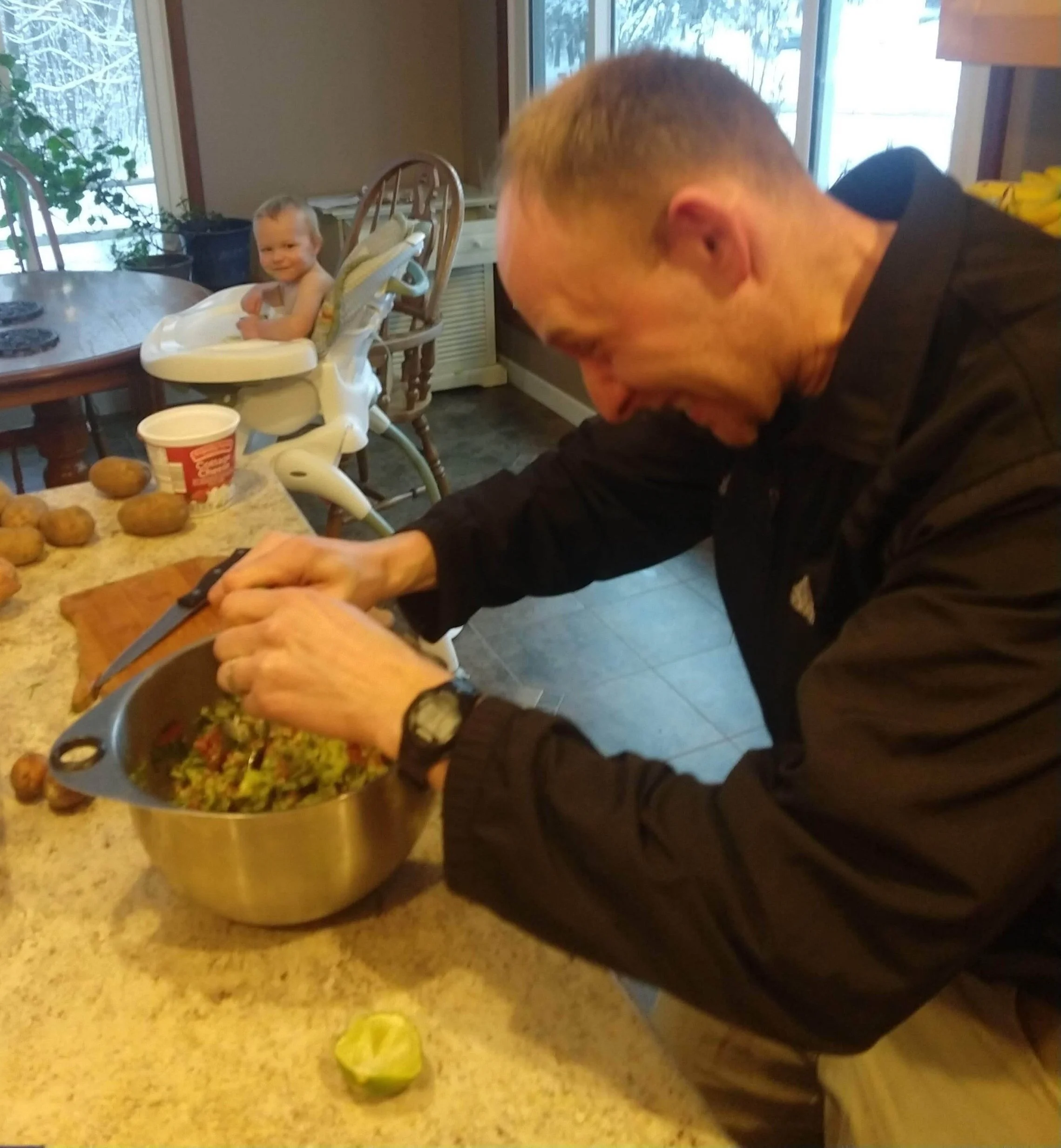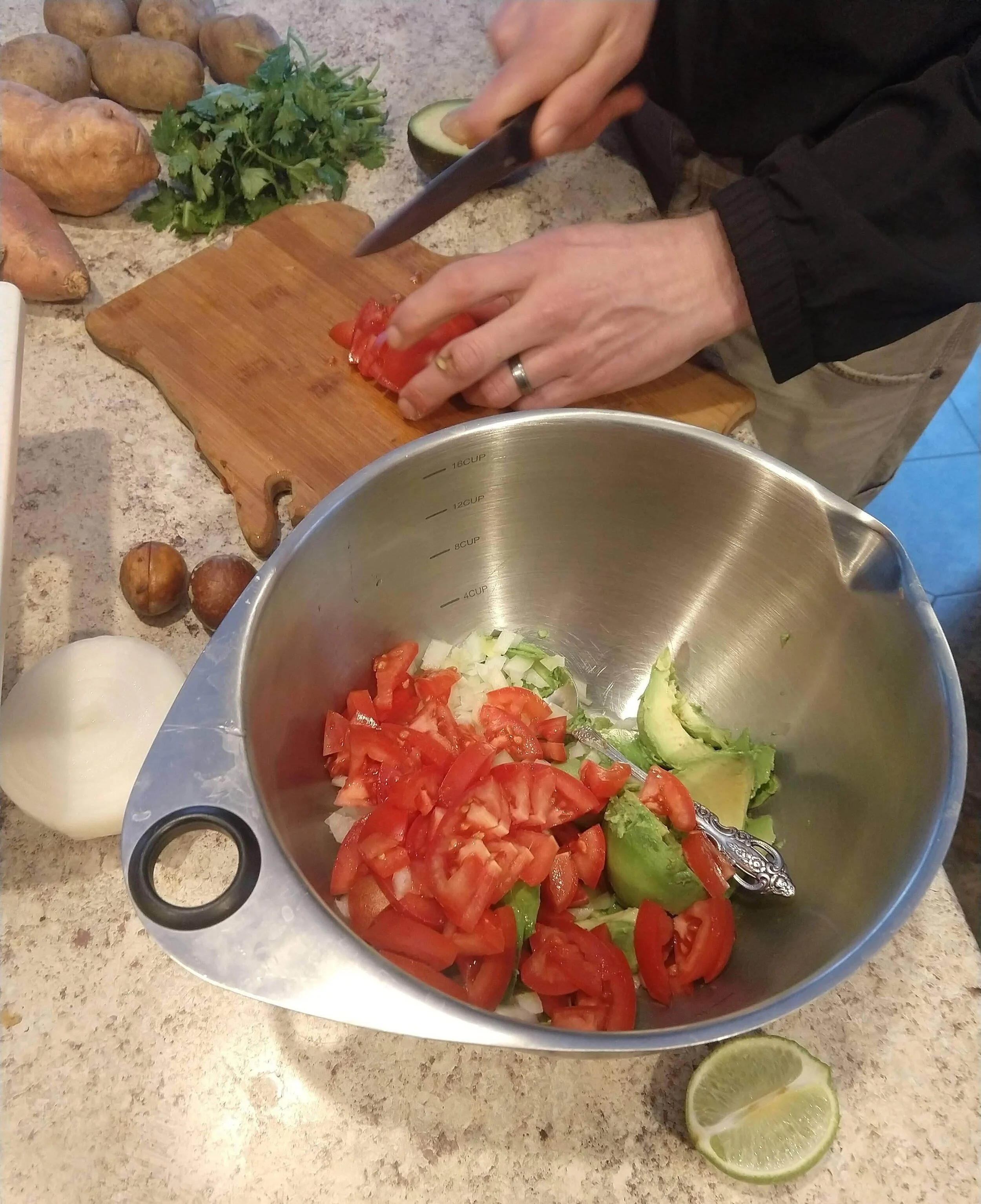 We work together to make guac - my husband is much more skilled at chopping than me - see he still has all his fingers!